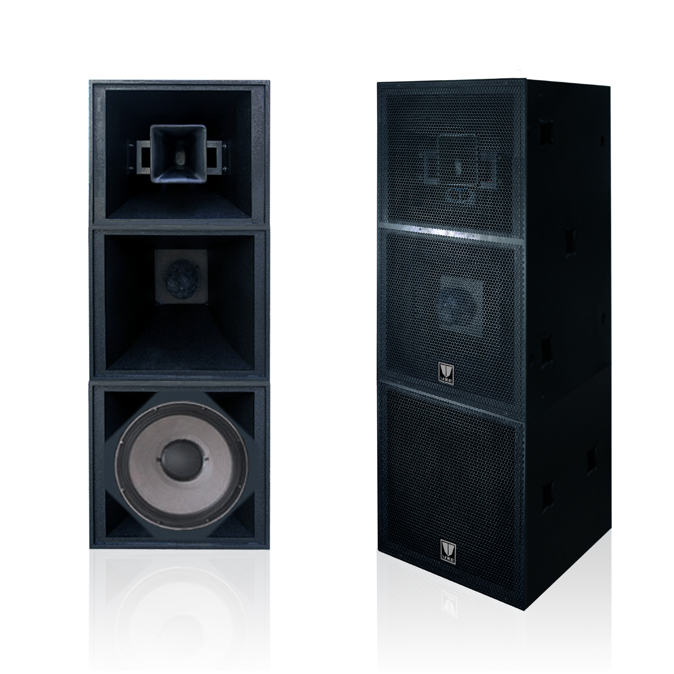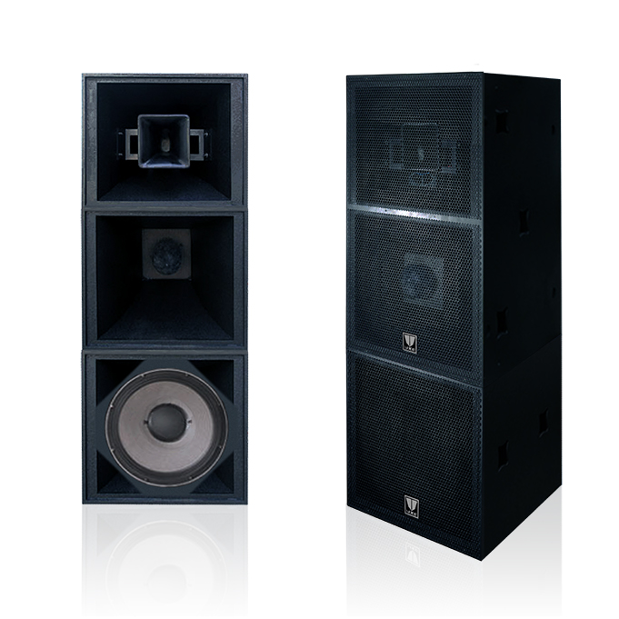 本揚聲器系統(tǒng)集眾多先進技術(shù)打造的演出級巨型揚聲器系統(tǒng); 2. 具有超大大功率輸出、保真度高、可靠耐用、等特性; 3. 特別適合大型戶外演出、體育場館、劇院、電視臺大型演播廳、大型禮堂、報告廳等高規(guī)格擴聲場所使用; 4. 單套可滿足1500人大型演出要求,多套組合可滿足萬人演出要求; 5. 箱體采用樺木夾板精制,并采用了最新工藝的D、F點漆技術(shù),堅固耐用; 6. 采用4分頻4單元電子分頻設(shè)計,內(nèi)置數(shù)字音頻處理電路; 7. 內(nèi)置數(shù)字功率放大器,可使用平衡線遠程傳輸信號,采用優(yōu)質(zhì)雙芯音頻線可滿足500米信號傳輸,而不必考慮信號衰減; 8. 采用18英寸(450mm)布褶環(huán)半松壓紙盆超低頻單元,安裝至獨立的箱體內(nèi),低頻響應(yīng)下沉至30Hz; 9. 采用15英寸(380mm)布褶環(huán)半松壓紙盆低音單元,配合60度指向號角,保持90-250Hz頻率力度強勁并可滿足低頻遠射程要求; 10. 采用10英寸(250mm)布褶環(huán)半松壓紙盆中音單元,配合60度指向號角,中頻響應(yīng)積極讓聲音充滿磁性同樣滿足遠射程要求; 11. 采用3英寸(72mm)鈦膜片壓縮式高音單元,配合90*40度玻璃鋼指向號角,高頻靚麗清澈且極付穿透力; 12. 4只單元均有單獨的數(shù)字式功率放大器驅(qū)動,避免產(chǎn)生頻段干擾、提高功放效率、降低功耗、提高分頻特性; 13. 單組系統(tǒng)功率達到2800W,兩組有效功率輸出高達5600W; |